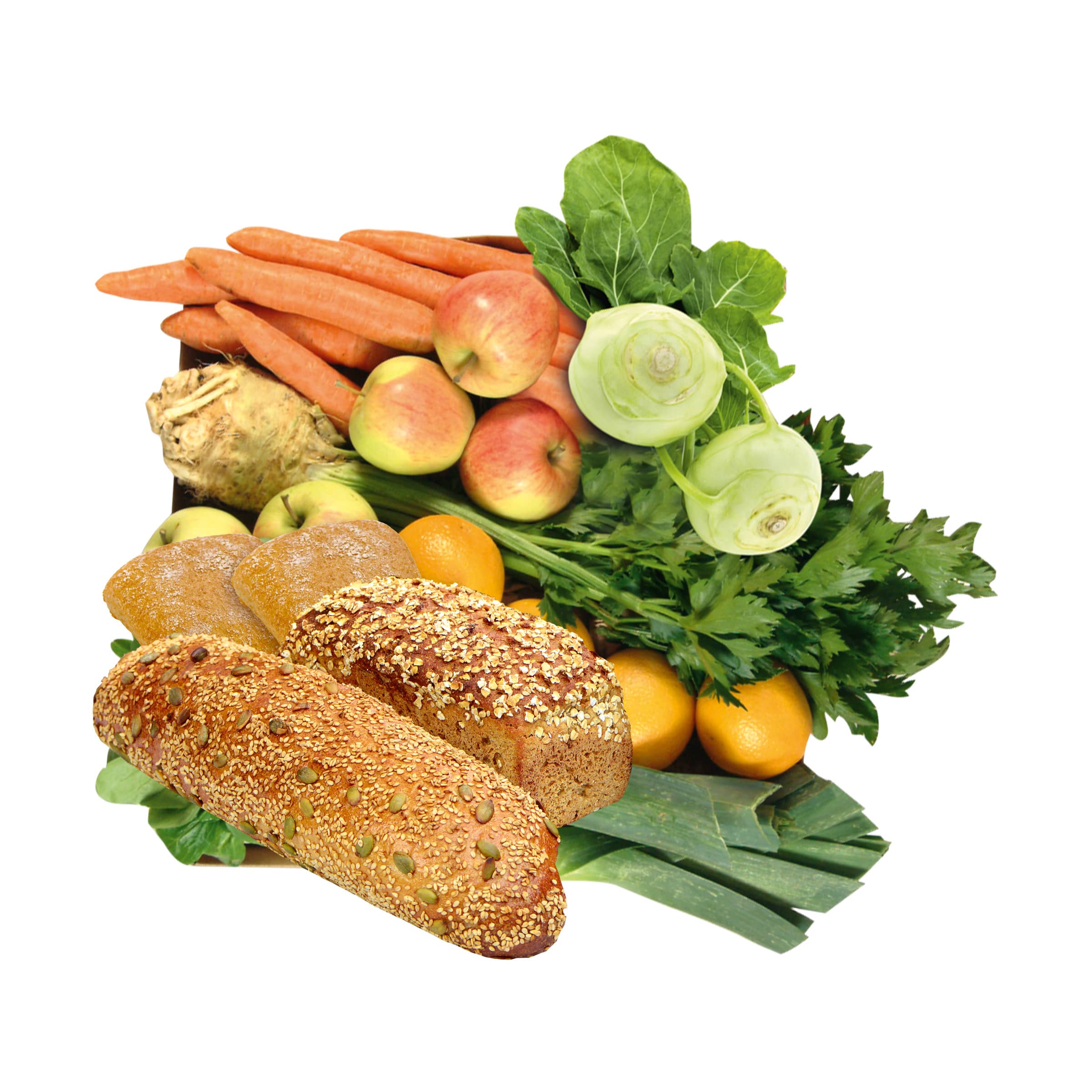 “Die große Mischung: Obst und Gemüse - mit Brot und Brötchen von Lebe Gesund im Wert von mehr als 12 €.”