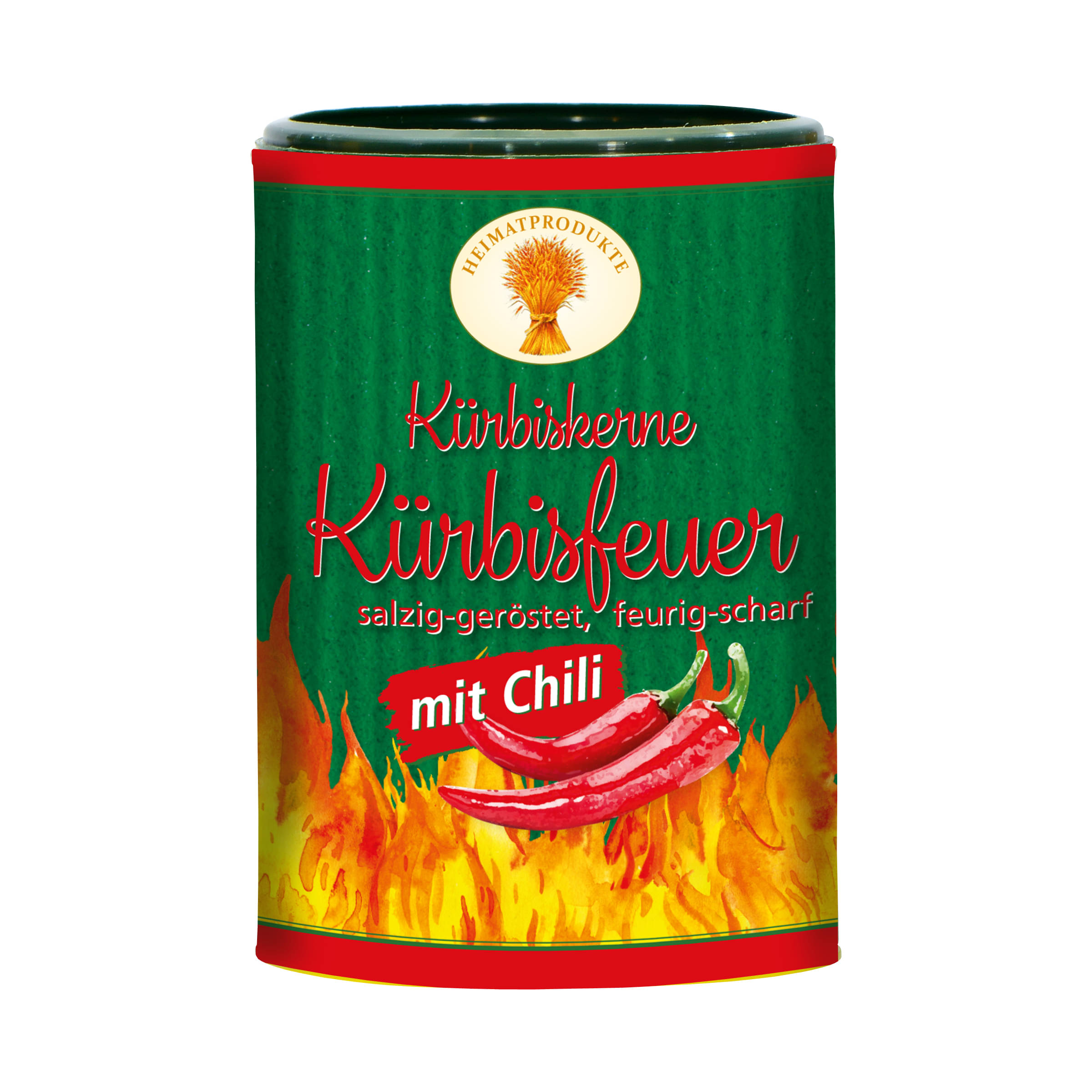 Kürbiskerne* 91%, Wasser, Steinsalz 2%, Rohrohrzucker*, Maisstärke*, Chili* 0,57%, Paprikapulver*, Pfeffer*