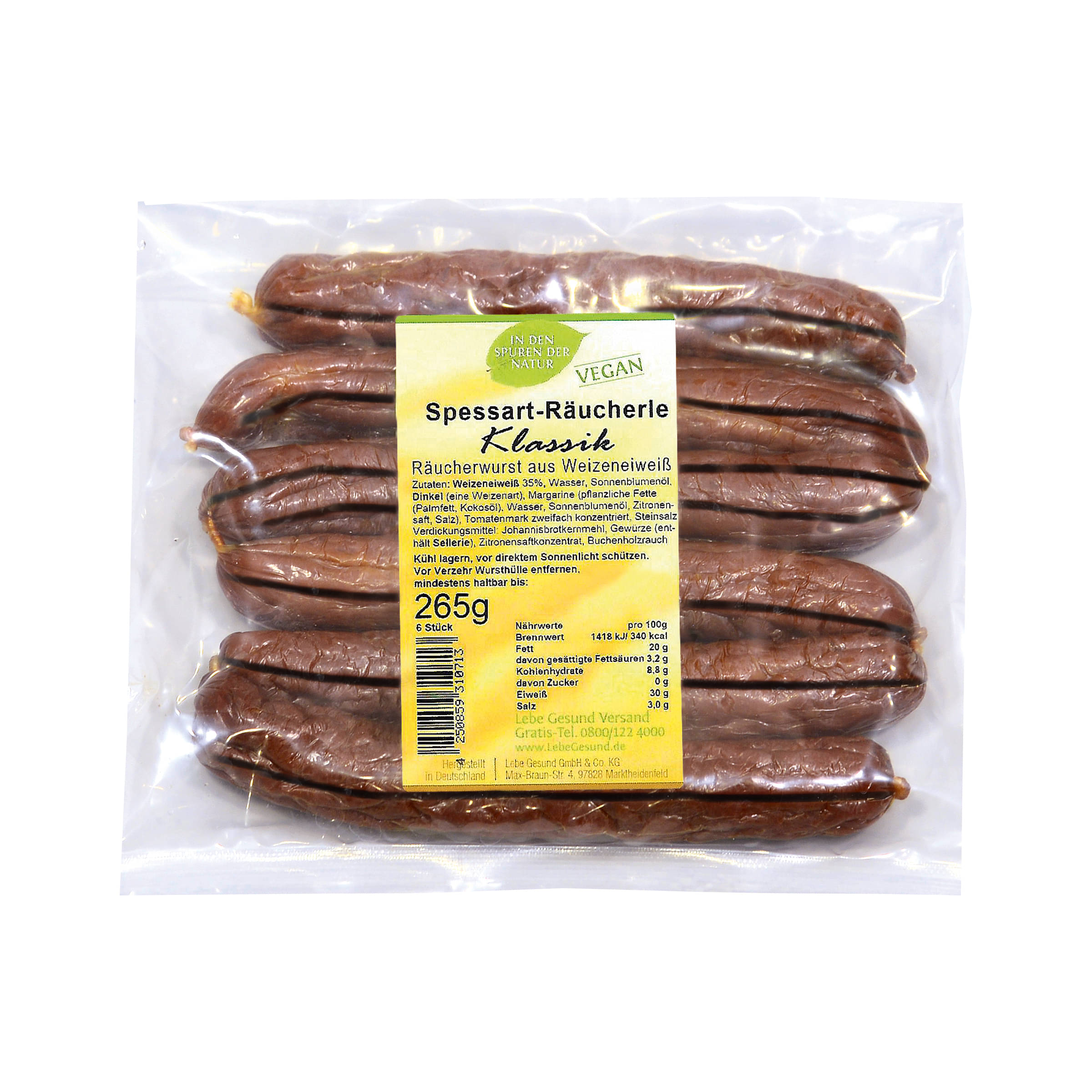 Weizeneiweiß 35%, Wasser, Sonnenblumenöl, Dinkel (eine Weizenart), Margarine (pflanzliche Fette (Palmfett, Kokosöl), Wasser, Sonnenblumenöl, Zitronensaft, Salz), Tomatenmark zweifach konzentriert, Steinsalz, Verdickungsmittel: Johannisbrotkernmehl, Gewürze (enthält Sellerie), Zitronensaftkonzentrat, Buchenholzrauch