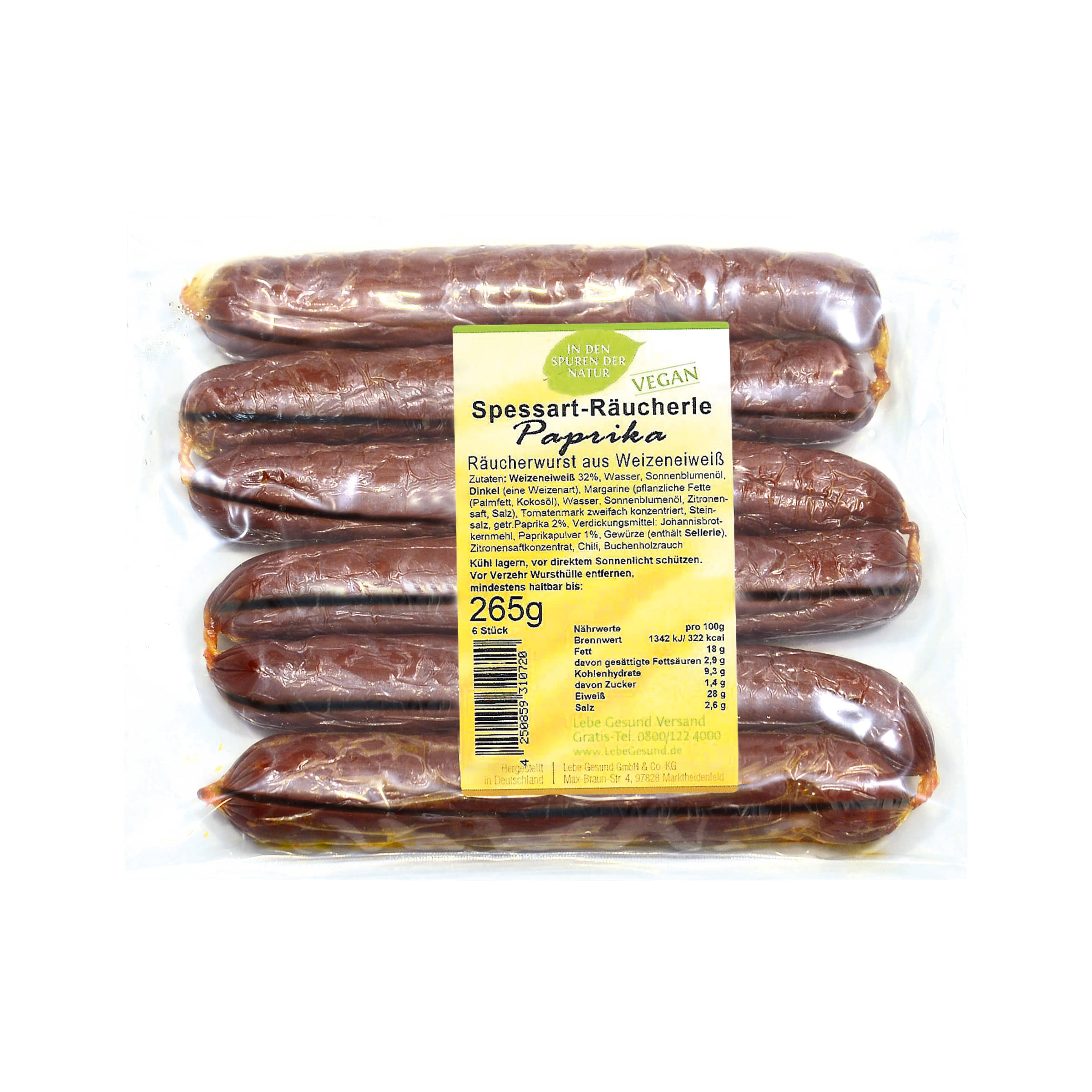 Weizeneiweiß 32%, Wasser, Sonnenblumenöl, Dinkel (eine Weizenart), Margarine (pflanzliche Fette (Palmfett, Kokosöl), Wasser, Sonnenblumenöl, Zitronensaft, Salz), Tomatenmark zweifach konzentriert, Steinsalz, getr. Paprika 2%, Verdickungsmittel: Johannisbrotkernmehl, Paprikapulver 1%, Gewürze (enthält Sellerie), Zitronensaftkonzentrat, Chili, Buchenholzrauch